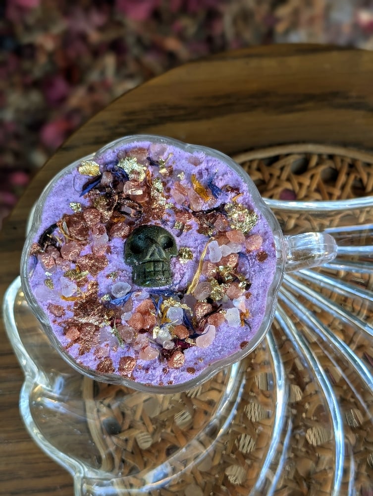 A collection favorite, this glass is so beautiful and will make a memorable bath, snack, relax combo. Inoauer with a charger skull crystal it's the perfect way to unwind after a long day or gift to a special friend. This is a vintage tea cup set was created with intentions and is intended to be used as a meditation tool. Blended with Sandalwood and Lavender to relax and soothe your mind. Infused with approx. 200 mg of CBD/CBG.